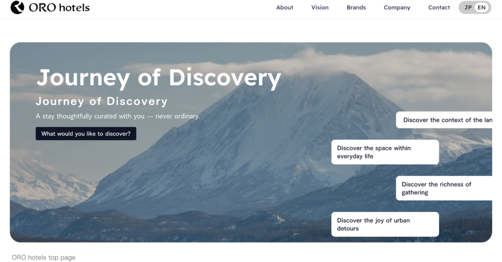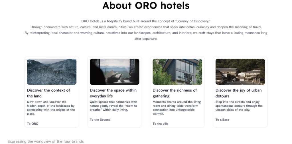 The official website will introduce the different philosophies and stay values of each of the four brands, clearly conveying the diverse “journey of discovery” envisioned by “ORO hotels.” In the future, the website will also gradually release content that conveys the philosophy of “ORO hotels,” such as introductions to planned opening locations, development stories, development reports for each facility, behind-the-scenes information on design direction, and collaboration with local communities.
